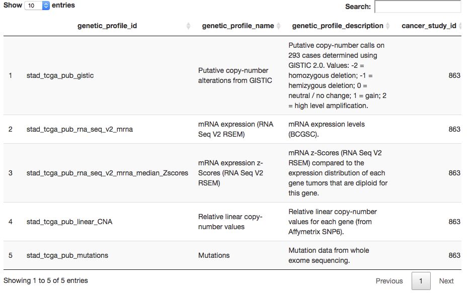 getGeneticProfiles(mycgds,mycancerstudy)[,1]