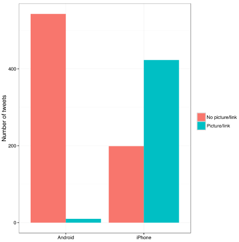iPhone:险些没有双引号 与此同时,在分享链接和图片时,安卓和 iPhone 也大不沟通。 tweet_picture_counts <- tweets %>% filter(!str_detect(text, ‘^”‘)) %>% count(source, picture = ifelse(str_detect(text, “t.co”), “Picture/link”, “No picture/link”))ggplot(tweet_picture_counts, aes(source, n, fill = picture)) + geom_bar(stat = “identity”, position = “dodge”) + labs(x = “”, y = “Number of tweets”, fill = “”)